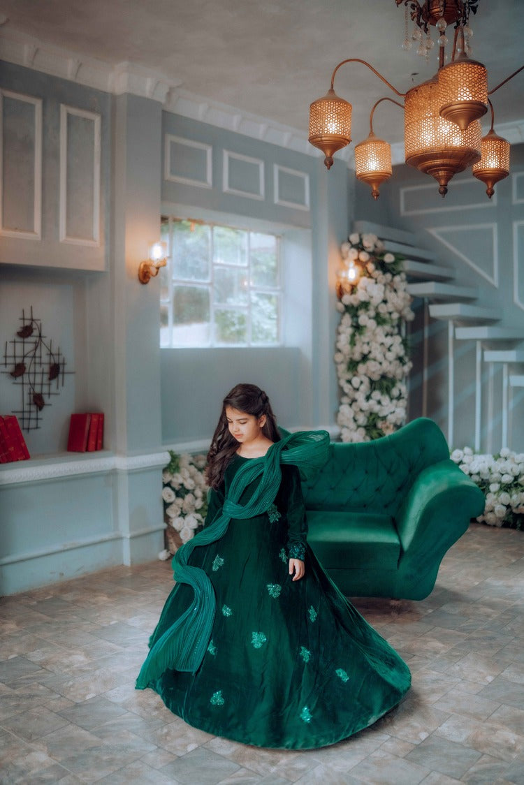 One of its kind meticulously designed velvet gown hand embellished with cascades of organza a subtle warm yet sparkly statement piece!