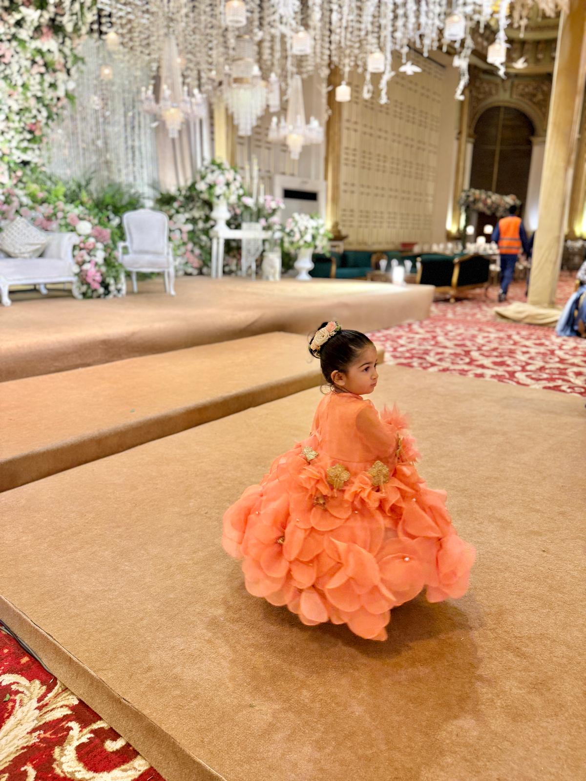 A full length ball gown adorned with more than 100 petals sewn together all over the hem with gold bead work in between a perfect statement piece paired with organza embellished cape
