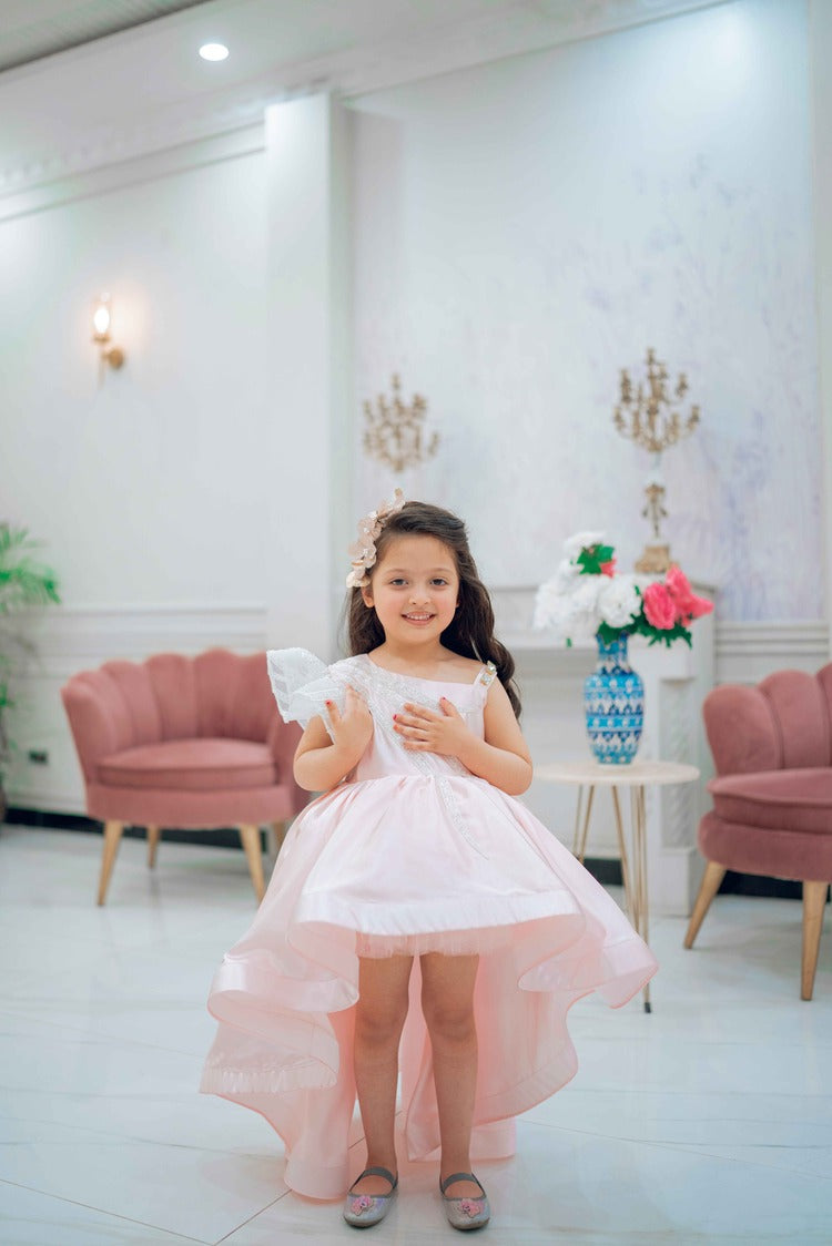 “Daisy Dress” from our SS23 is a high low satin silk gown with embellished bodice and statement shoulder all those dainty pink pastels for your dream party!