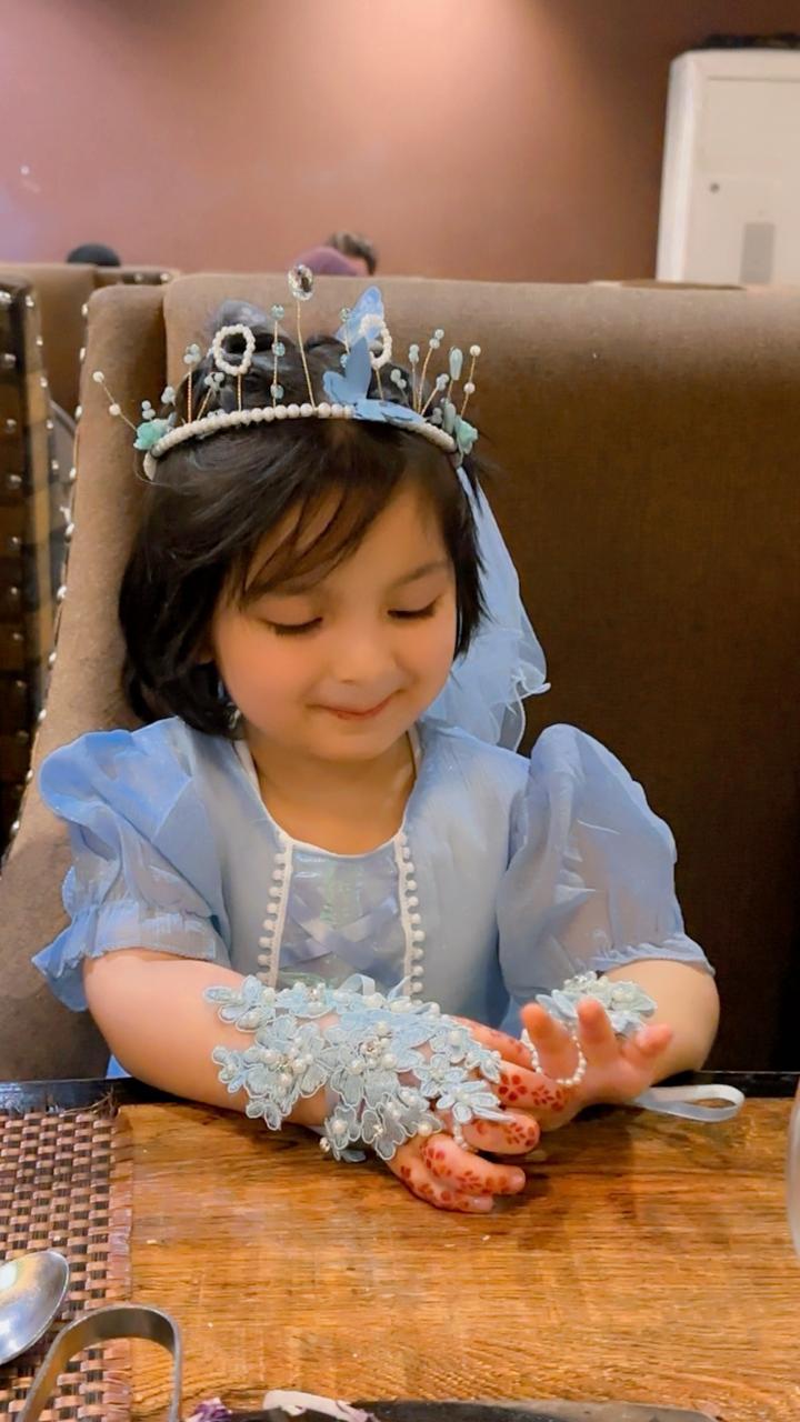 Features delicate embroidery with pearl ring and ribbon tied at back