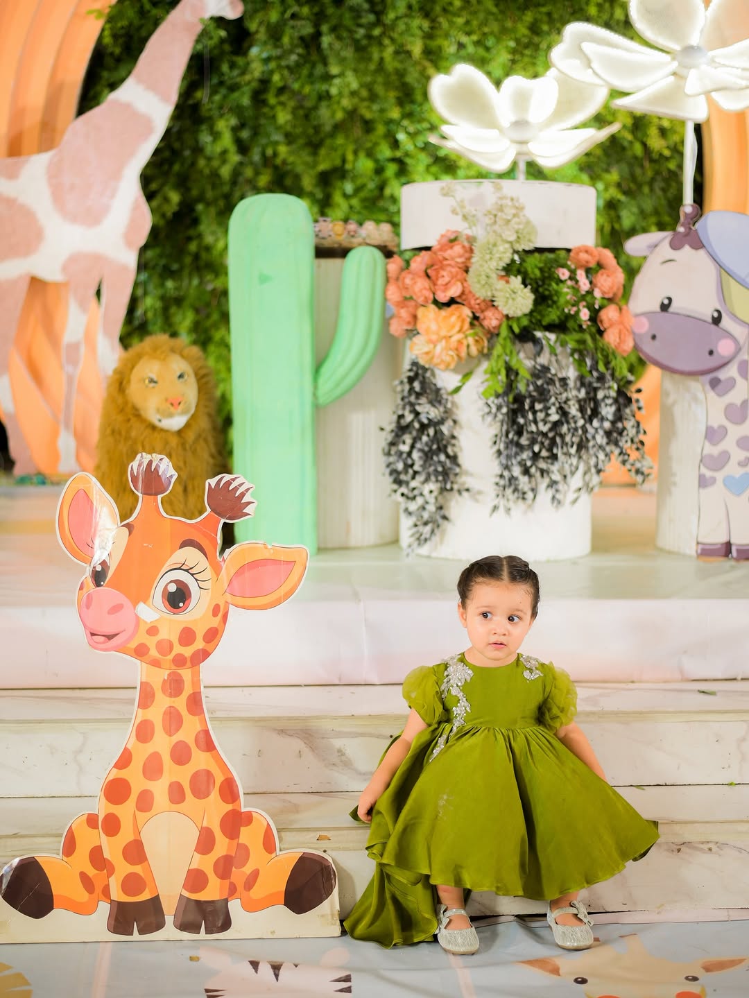 A pickle green coloured dress curated from matte silk paired with puffed sleeves and intricate work on bodice.