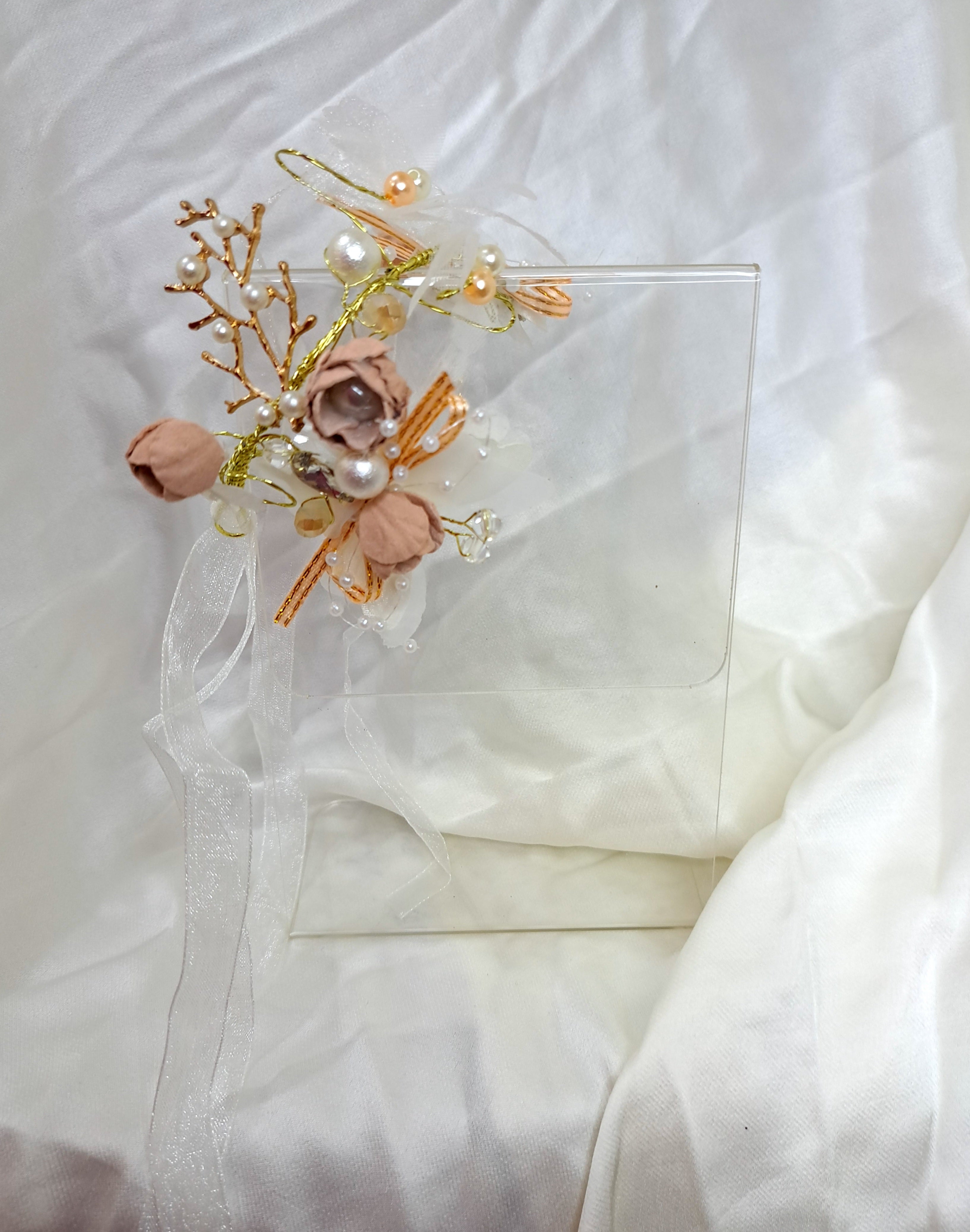 Delicate floral wristlet made of flowers butterflies and metallic stamens.