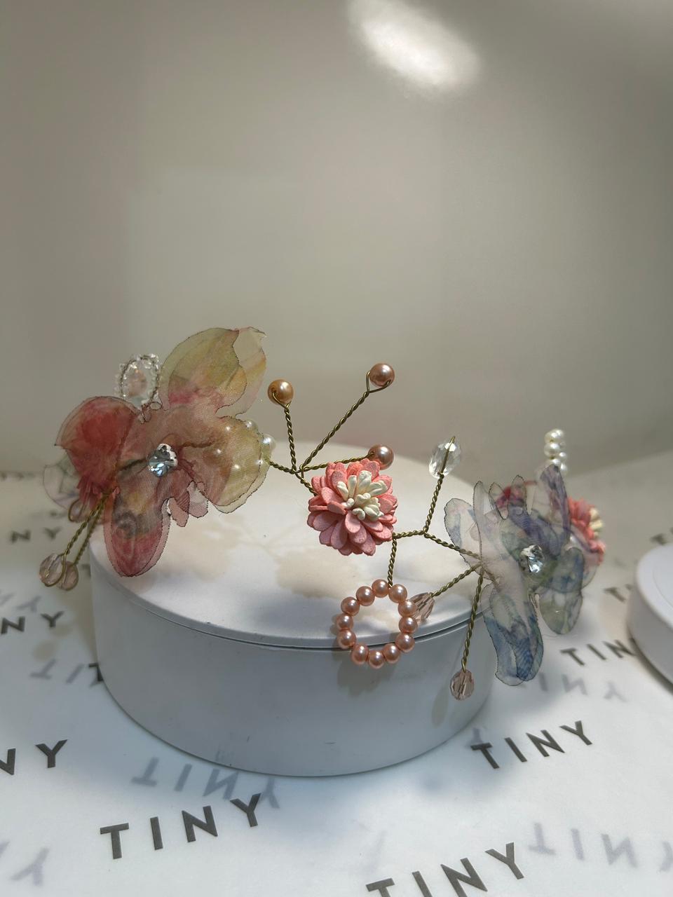 Flutter tiara is adorned with three - dimensional flowers and butterflies with a ribbon tied at back!