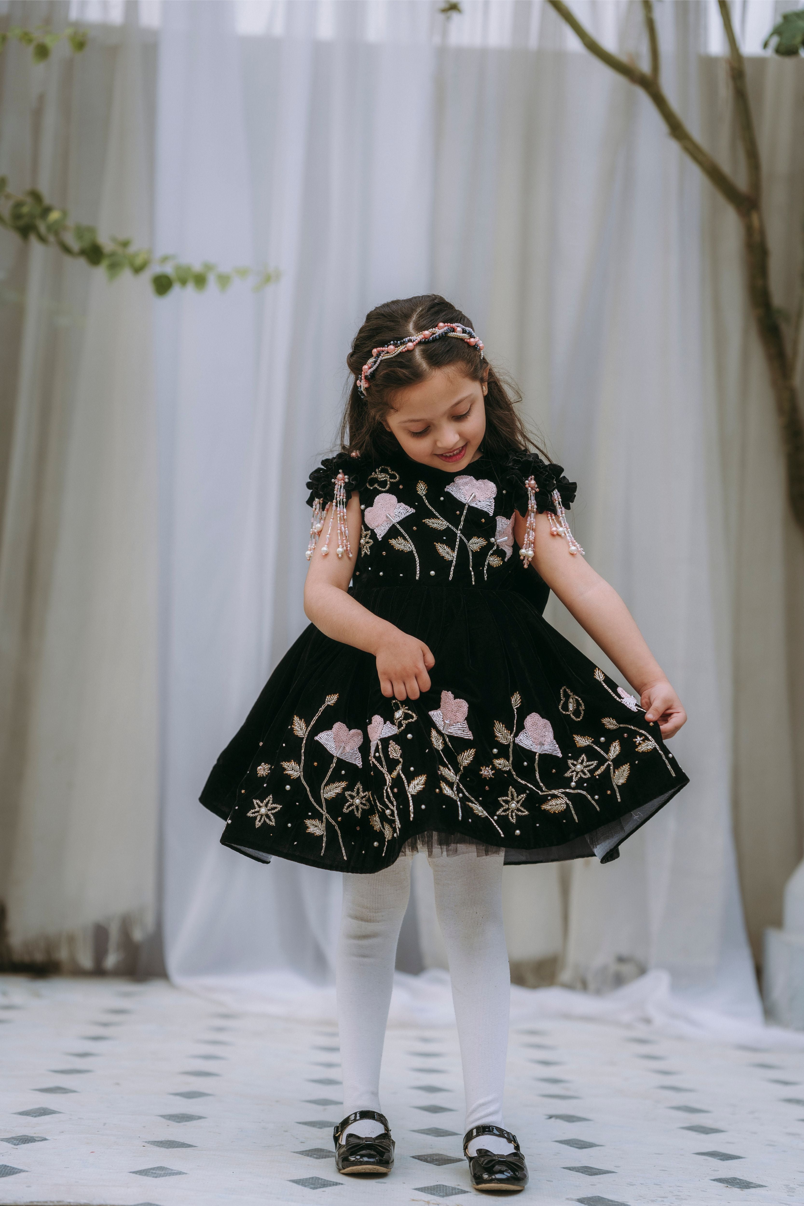 A knee length gown crafted in pure micro velvet hand worked with sequin beads crystals and pearls with dangling floral design on shoulders for those who want to stand out