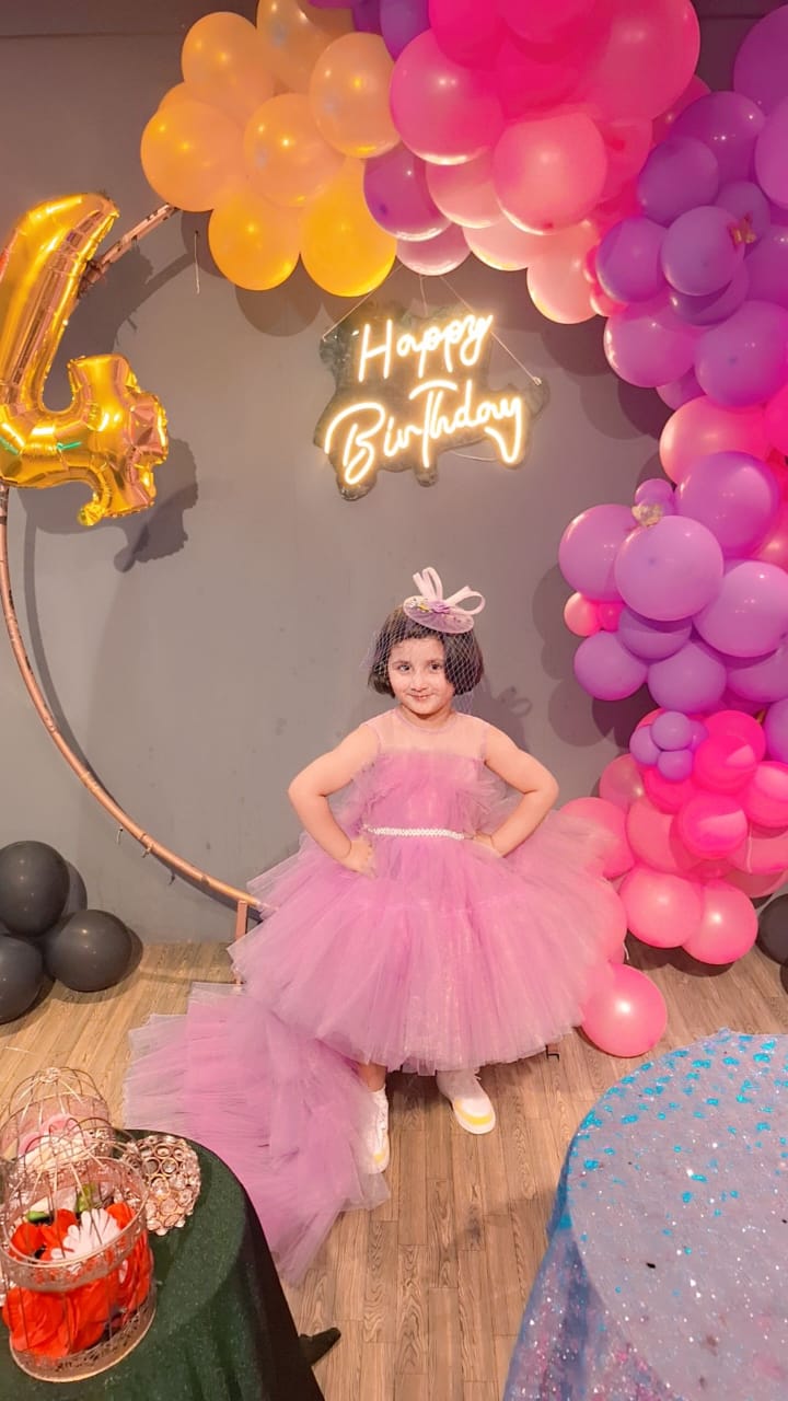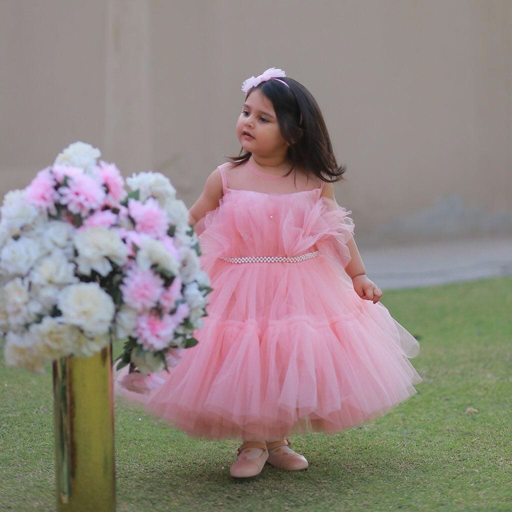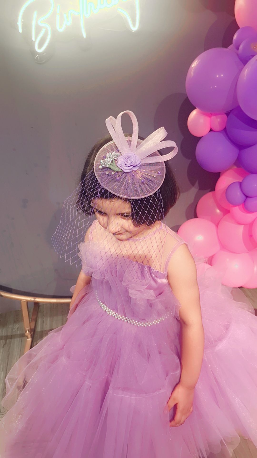 Layered lilac is a high low ruffled dress with the front as knee length and back tail extending 20 inches on floor embellished with hand beaded pearl belt!