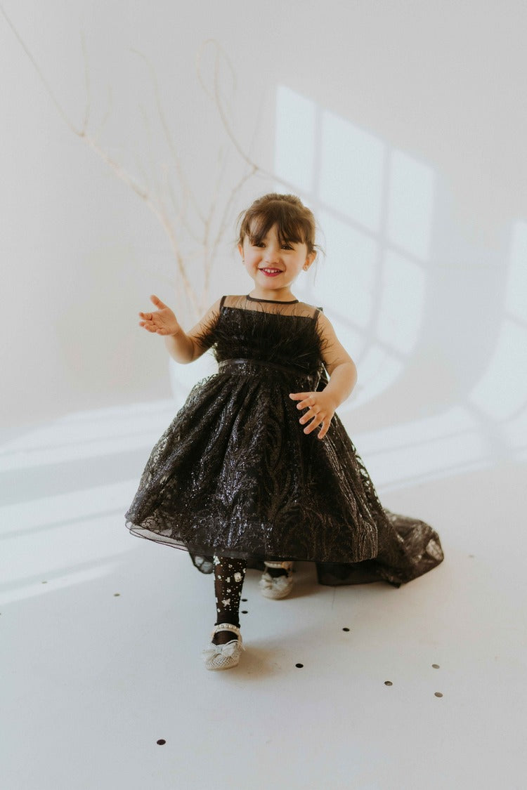 First look from our SS24 Mink Wink in Black A three-tiered high-low gown in a pretty black pattern with ostrich feathers all around bodice, Just the right amount of.