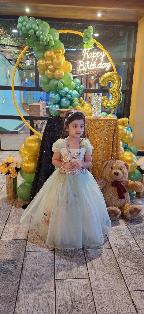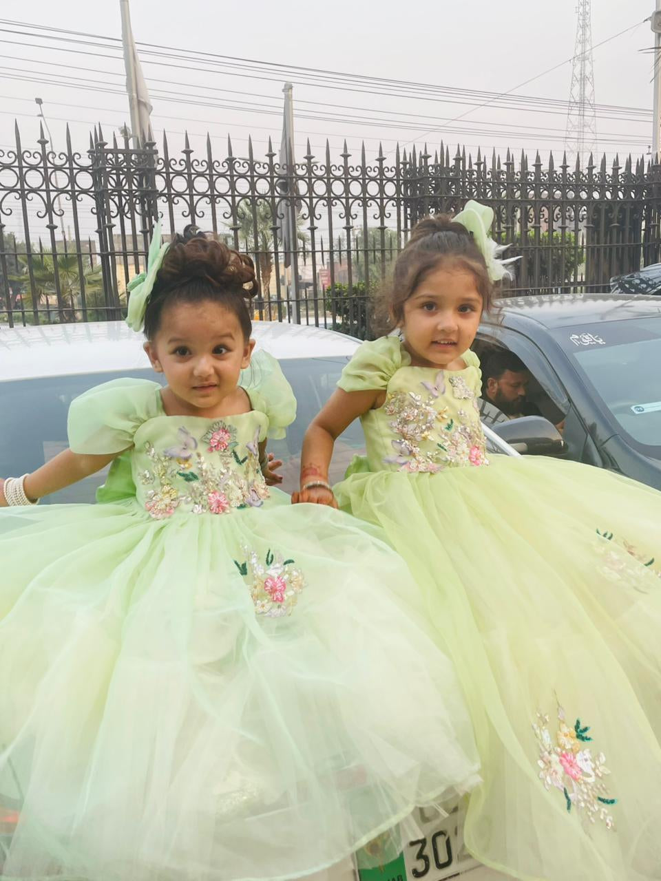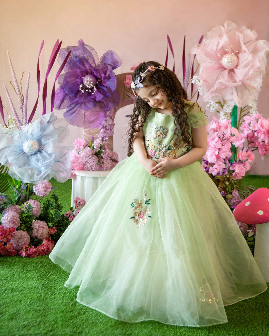 A full length organza gown in pistachio colour adorned with hand beaded embroidery .