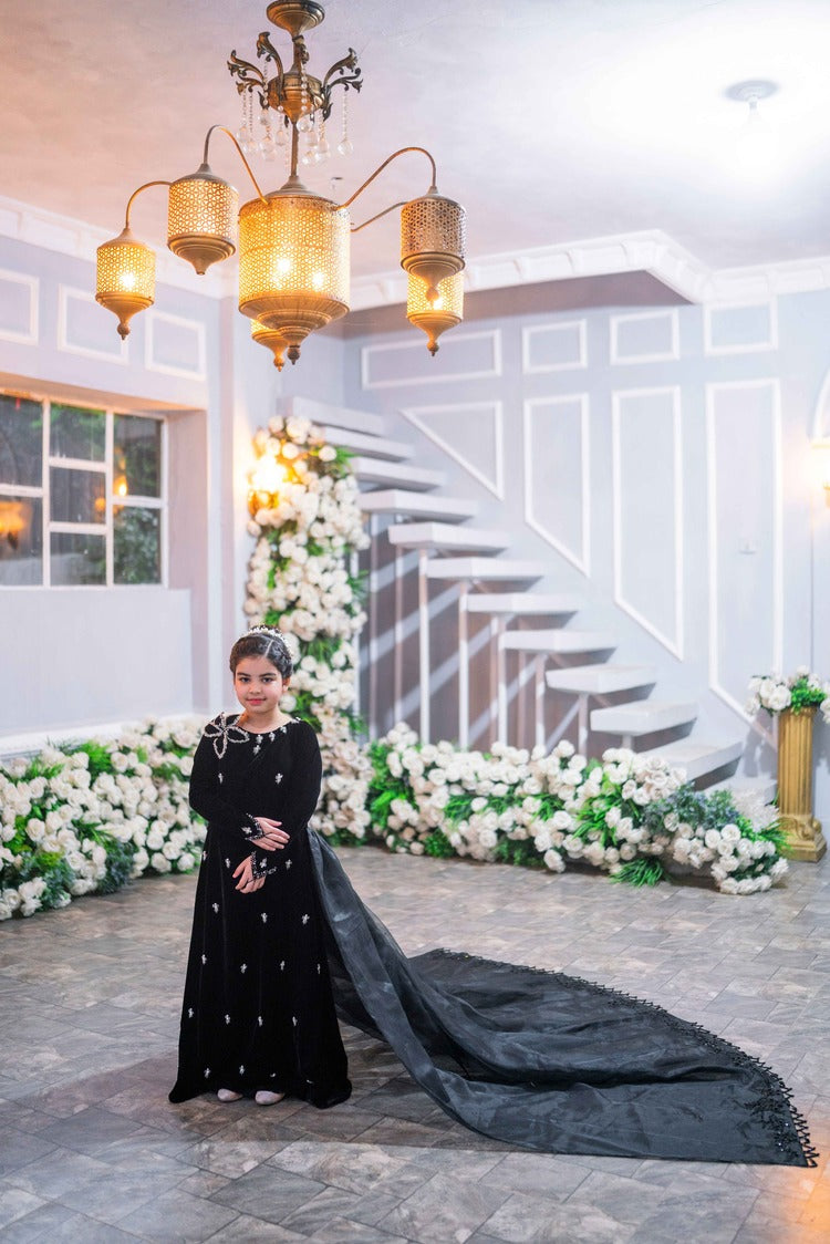 Features a straight silhouette in high quality velvet beaded to perfection accentuated with a floral brooch and a long organza crytal hem tail !