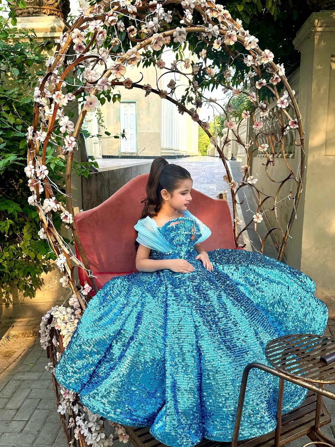 A structured french sequin ball gown paired with structured organza drape over shoulders in hues of ocean blue✨️