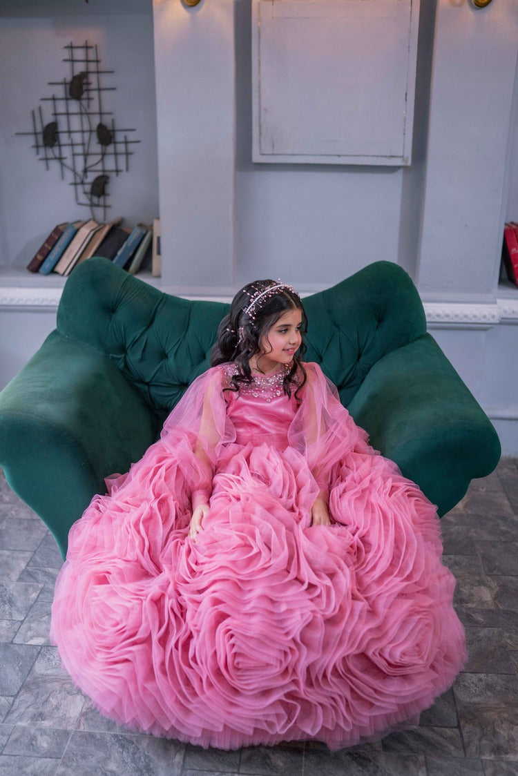 A floral net gown in beautiful hues of pink adorned with ruffled buds all around paired with bolero intricately embellished with high quality crystals!