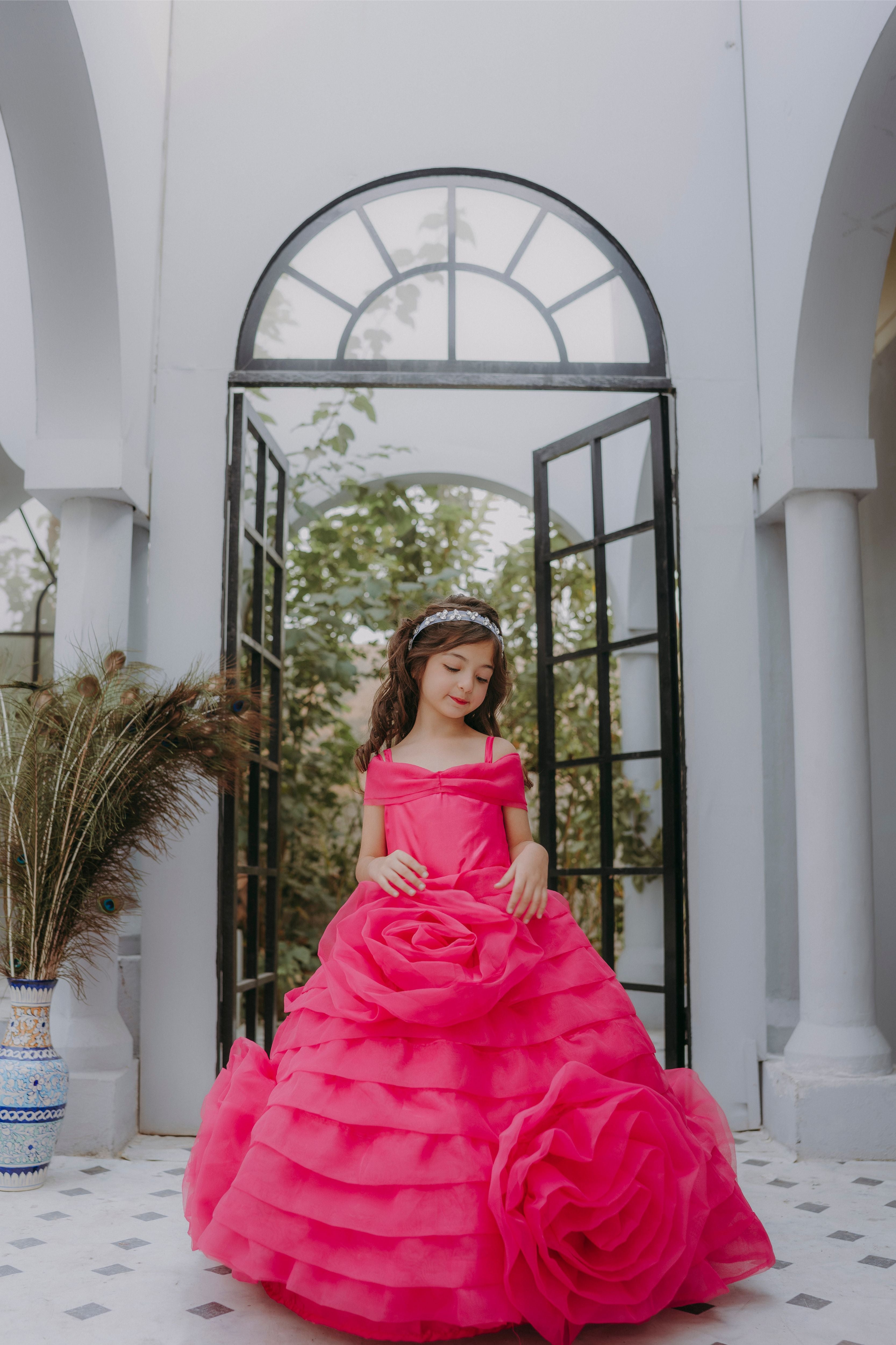 A full length organza ball gown in prettiest hue of fuchsia sewn delicately in floral pattern all over the flare to make your lil one look their best!