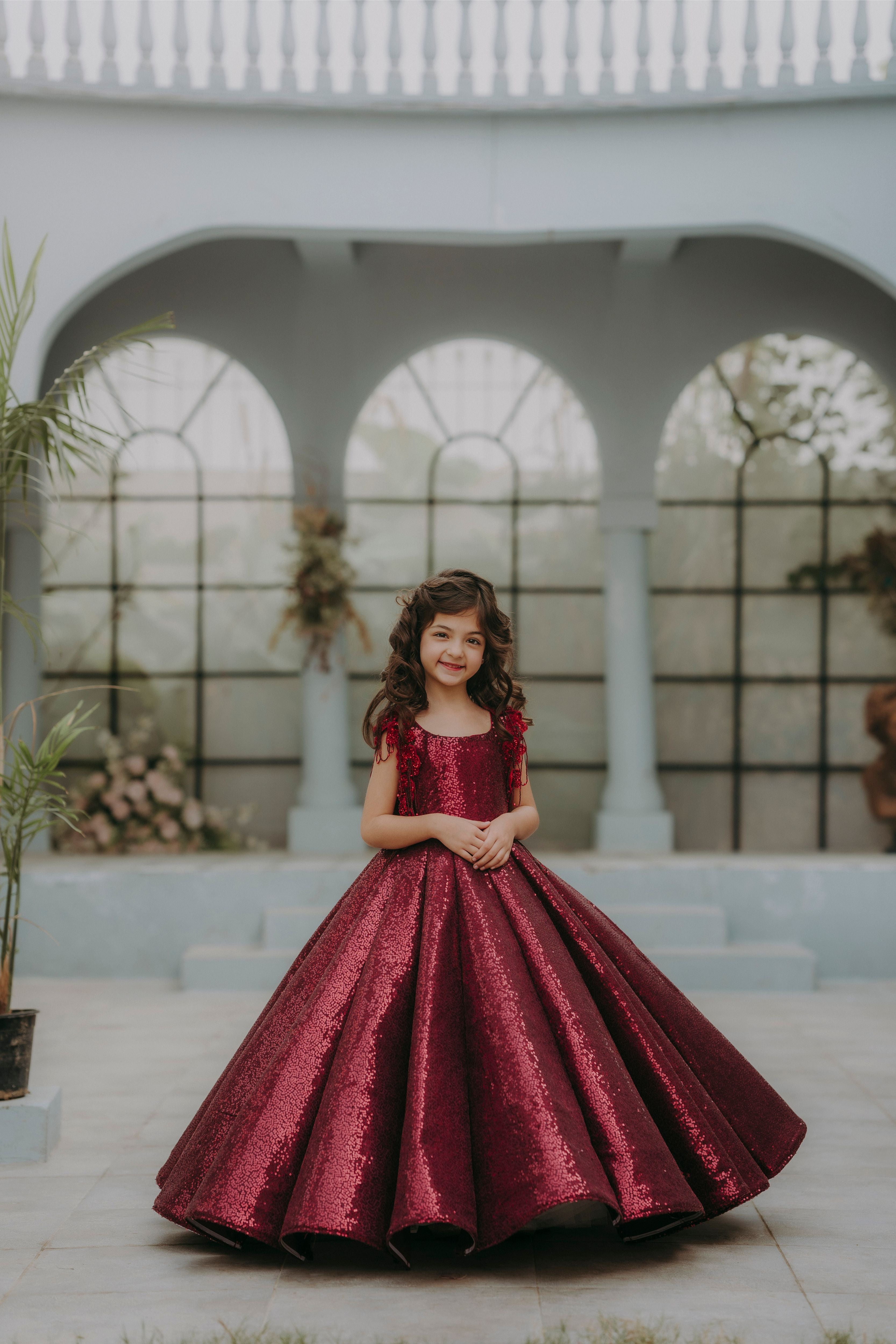 Sequins, sparkle, and a dash of royalty! Our 2025 collection's maroon sequin ball gown is the perfect choice for your baby girl's special occasions adorned with hand beaded flowers arranged in an array of bead strands on shoulder.