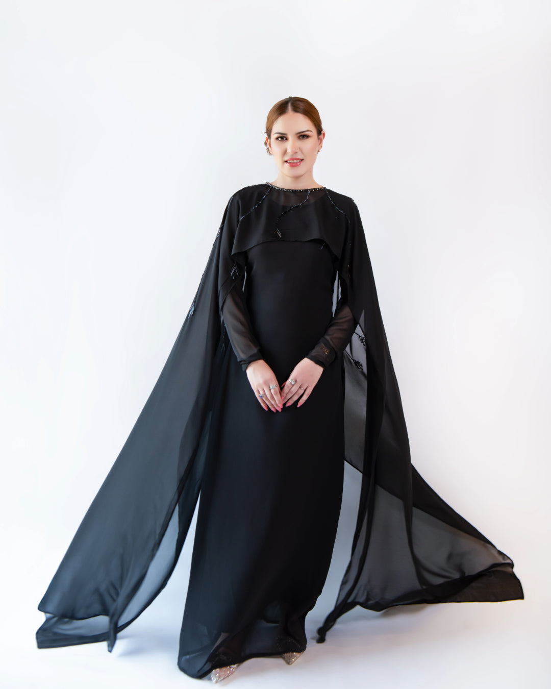 Asymmetrical embellished cape hand worked with sequins and beads.