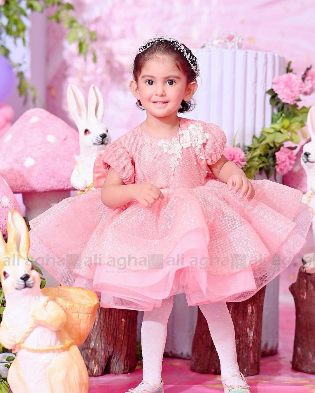 Twinkle dress is crafted in the most exclusive glitter fabric one of its kind paired with crin hem structured in layers embellishments on neckline paired with accentuated sleeeves in beautiful hues of peachy pink!
