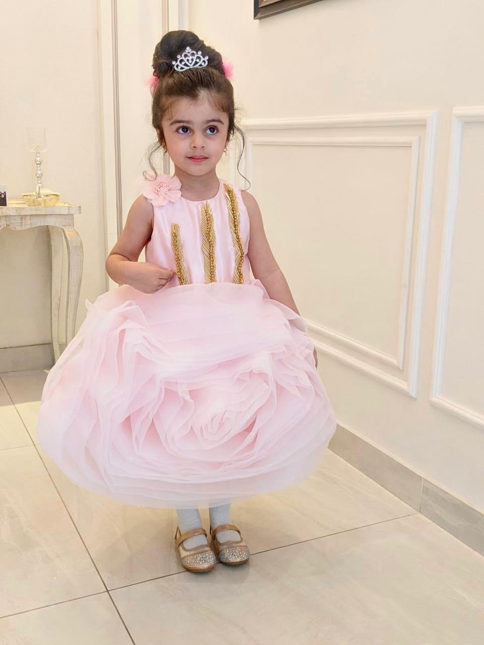 Ruffle rose a knee length version with heavily embellished bodice in hues of pastel pink!